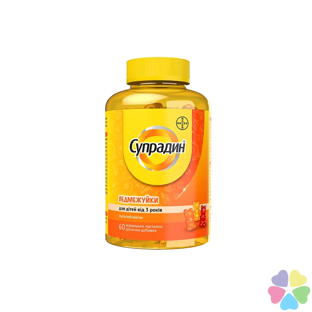 Супрадин Ведмежуйки пастилки жув. №60 у флак. можна купити в наших аптеках зараз тут: Свободи 2,  Охматдет,  Черновола,  Павлівська,  Андрея Верхогляда,  Комфорт Таун,  Новопечерські Липки, Ернста 16Б,  Мінська, Петропавлівська Борщагівка, Раїси Окіпної 10А,  Русанівка,  Аппетит, Драгоманова,  Наше NEBO, Сімї Кульженків 37,  Петрівський квартал, Глеваха, Щербаківського 52, Ірпінь, Дарниця,  Либідьска,  Уютний,  Величка Михайла 10Б,  Лоток, Бажана Миколи 10, Садова,  Комфорт Таун 3, Печерський,  Верхогляда, Грінвіль, Садова 2, , Берковецька,  Франка, Вишгород
