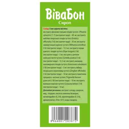 Діючі речовини: 5 мл сиропу містять: екстракту фінікової пальми плодів густого (Phoenix sylvestris) (1:7) (екстрагент вода) 60 мг; екстракту ембліки лікарської плодів густого (Emblica officinalis) (1:6) (екстрагент вода) 35 мг; екстракту зимової вишні коріння густого (Withania somnifera) (1:6) (екстрагент вода) 12,5 мг; екстракту перцю довгого плодів густого (Piper longum) (1:8) (екстрагент вода) 5 мг; екстракту центели азійської листя густого (Centella asiatica) (1:6) (екстрагент вода) 12,5 мг; екстракту амомуму шиловидного плодів густого (Amomoum subulatum) (1:8) (екстрагент вода) 5 мг; екстракту імбиру лікарського кореневищ густого (Zingiber officinalis) (1:6) (екстрагент вода) 10 мг; екстракту пажитника грецького насіння густого (Trigonella foenum graecum) (1:8) (екстрагент вода) 10 мг; екстракту волошки коріння густого (Cetaurea behan) (1:8) (екстрагент вода) 10 мг.