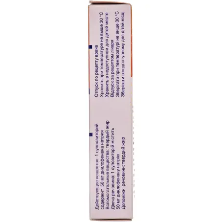 Склад: 1 супозиторій містить диклофенаку натрію 50 мг (DICLOFENACUM NATRIUM)