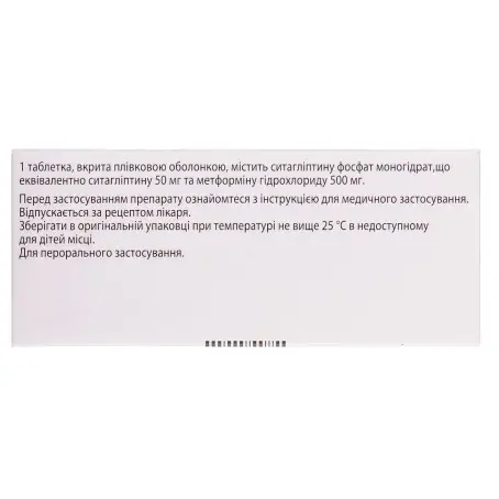 Склад: 1 таблетка, вкрита плівковою оболонкою, містить ситагліптину фосфату моногідрату еквівалентно 50 мг ситагліптину та 500 мг метформіну гідрохлориду (Sitagliptinum)