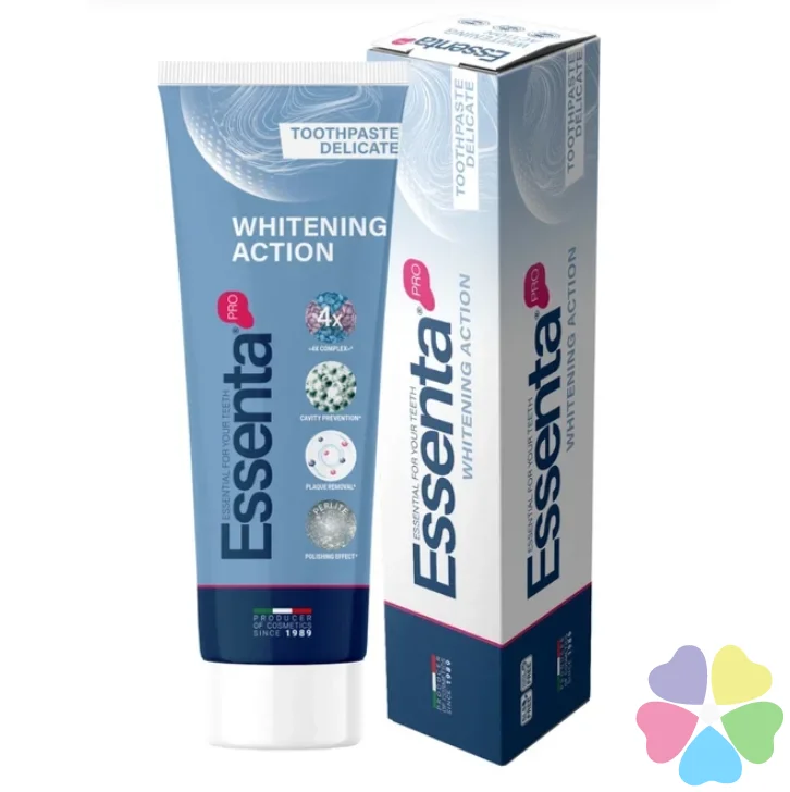 Показання до використанняЗубна паста розроблена для щоденного делікатного відбілювання та профілактики карієсу. Завдяки мінеральному комплексу «4х» ефективно усуває потемніння емалі від фарбувальних речовин, запобігає утворенню нальоту й каменю, підтримує природну білизну зубів та забезпечує гладкість і чистоту емалі між чистками