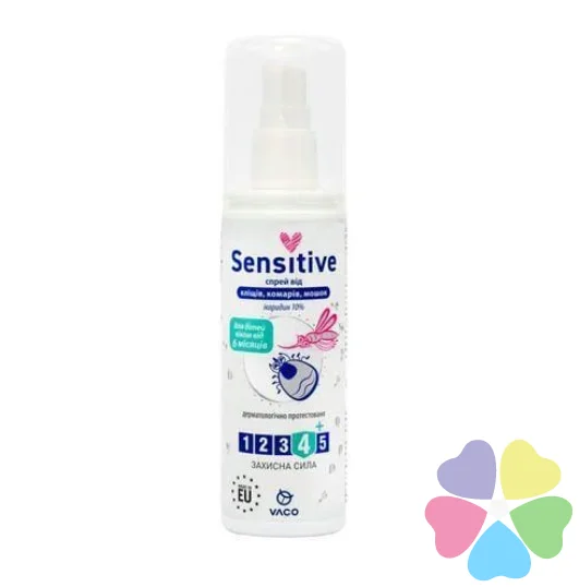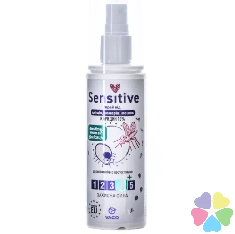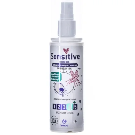 Спрей Vaco Sensitive — це надійний захист і максимальна безпечність від укусів комах для дітей від 6 місяців! Флакон зі зручним пульверизатором акуратно розпилює рідину, не спричиняє подразнення і неприємних відчуттів.