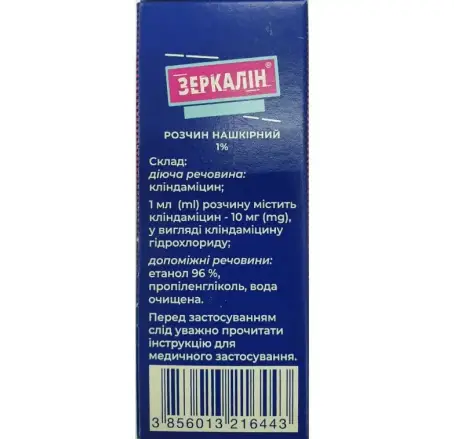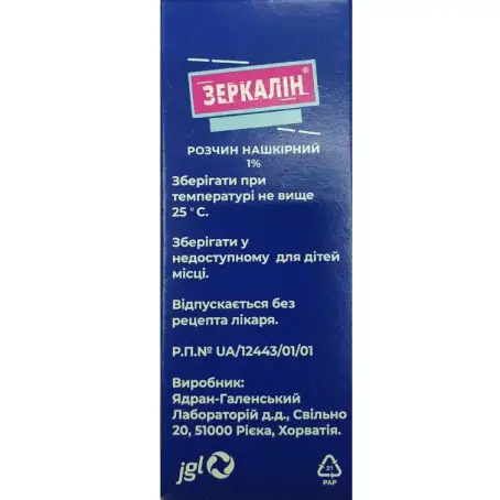 Тонкий шар розчину Зеркалін® наносити на уражену ділянку очищеної шкіри 2 рази на добу. Тривалість застосування визначає лікар індивідуально.