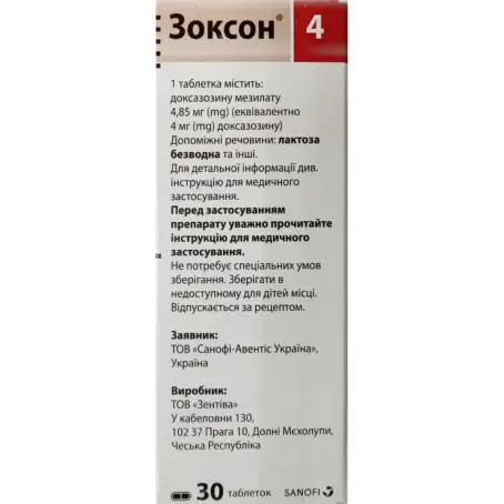 Склад: 1 таблетка містить доксазозину мезилату 4,85 мг, що еквівалентно 4 мг доксазозину (DOXAZOSINUM)
