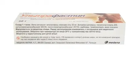 Препарат Ультрафастин гель 2.5% 50 г является высокоэффективным средством в борьбе с посттравматическими проявлениями боли в уставах и мышцах. Также он широко используется для снятия воспалительного процесса с сухожилий после различных травм. В Украине гель Ультрафастин, относящийся к нестероидным лекарственным средствам, реализуется строго по рецепту.