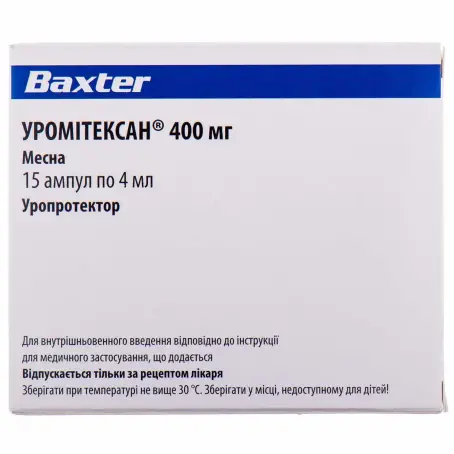 | Уромитексан® 400 мг, инфузия | до 5 г/м2 площади поверхности тела (≈ 125 мг/кг массы тела) дополнительно к инфузии и фосфамида | до 2,5 г/м2 площади поверхности тела (≈ 62,5 мг/кг массы тела) | |||||||