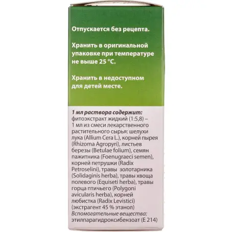 Состав: 1 мл раствора содержит фитоэкстракт жидкого (1:5,8) - 1 мл, из смеси лекарственного растительного сырья: шелуха лука (Allium Cera L.), корни пырея (Rhizoma Agropyri), листья березы (Betulae folium), семена пажитника (Foenиgraeci semen), корни петрушки (Radix Petroselini), травы золотарника (Solidaginis herba), травы хвоща полевого (Equiseti herba), травы горчака птичьего (Polygoni avicularis herba), корни любистки (Radix Levistici4) (экстрагент) (Peel of onion)
