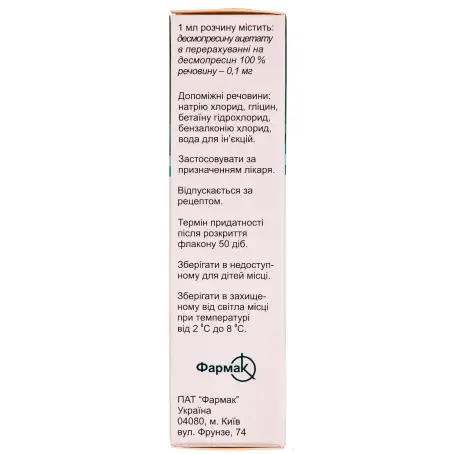 1 мл раствора содержит десмопрессин ацетат в перечислении на десмопрессин 100% вещество 0,1 мг;