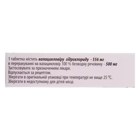 1 таблетка содержит гидрохлорида валацикловира 556 мг в перечислении на валацикловир 100% безводное вещество 500 мг;