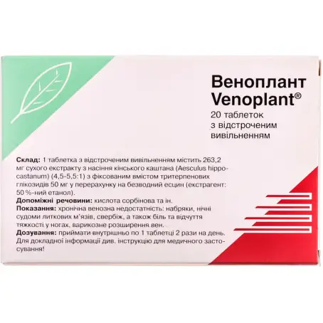 1 таблетка с отсроченным высвобождением содержит: 263,2 мг сухого экстракта семян конского каштана ( Aesculus hippocastanum ) (4,5-5,5:1), что соответствует 50 мг тритерпеновых гликозидов в перечислении на безводный эсцин (экстрагент: этанол 5 /м));