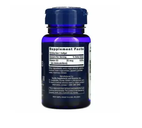 В каждой капсуле Витамина Д-3, Vitamin D3, Life Extension,содержится 25 мкг (1000 МЕ) витамина D3 в форме холекальциферола.