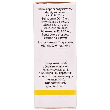 действующие вещества: 100 мл препарата содержит: Salvia D1 7 мл, Belladonna D6 10 мл, Phytolacca D6 10 мл, Lachesis D12 10 мл , Mercurius solubilis Hahnemanni D12 10 мл;