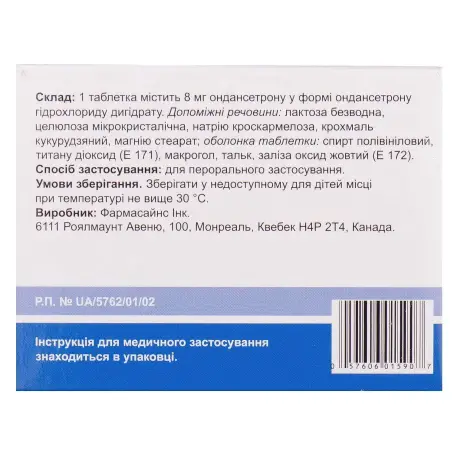 1 таблетка содержит 8 мг ондансетрона в форме ондансетрона гидрохлорида дигидрата;
