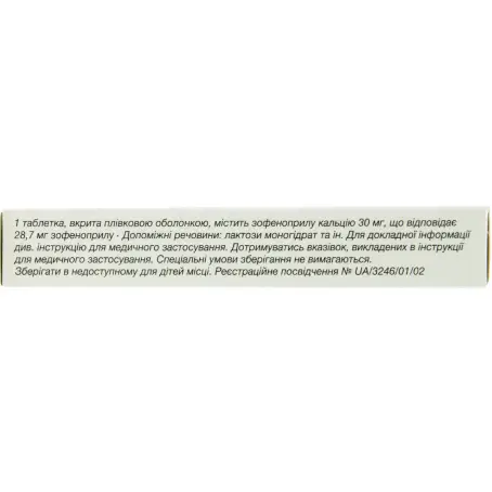 действующее вещество: 1 таблетка, покрытая плёночной оболочкой, содержащая зофеноприла кальция 30 мг, что эквивалентно 28,7 мг ;