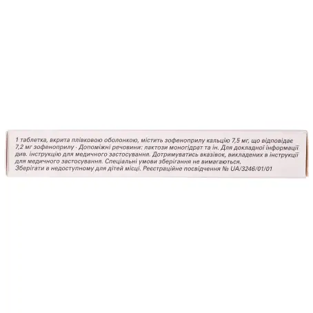 Состав: 1 таблетка, покрытая пленочной оболочкой, содержит зофеноприл кальция 7,5 мг, что эквивалентно 7,2 мг зофеноприла (Zofenopril calcium)