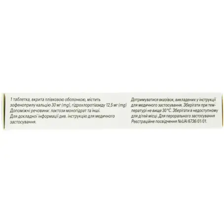 1 таблетка, покрытая пленочной оболочкой, содержит зофеноприла кальция 30 мг, эквивалентного зофеноприла 28,7 мг и гидрохлоротиазида 12,5 мг;