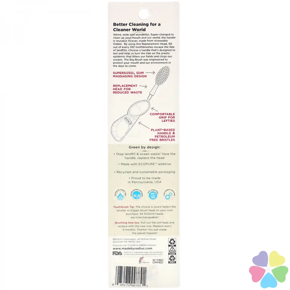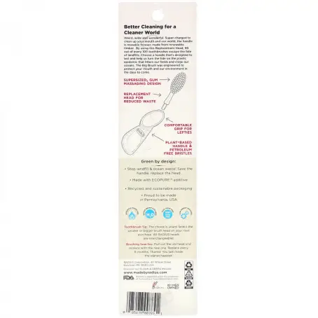 Big Brush имеет уникальный дизайн: сочетает сменную головку с нестандартной большой площадью поверхности для глубокой мягкой чистки и эргономичную ручку, специально разработанную отдельно для левшей, отдельно для правшей.
